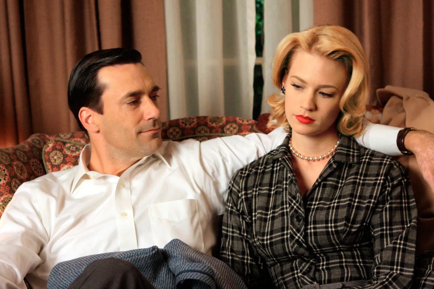 From their red-doored house in the commuter town on the Hudson River, to the dimpled boy-girl kids, to their jobs – Betty: model turned housewife; Don: salesman turned adman – The Drapers are the perfect post-war couple. Neighbours talk about them. Co-workers ogle at them. Strangers are jealous of them. They are, in many ways, the epitome of The Joneses.